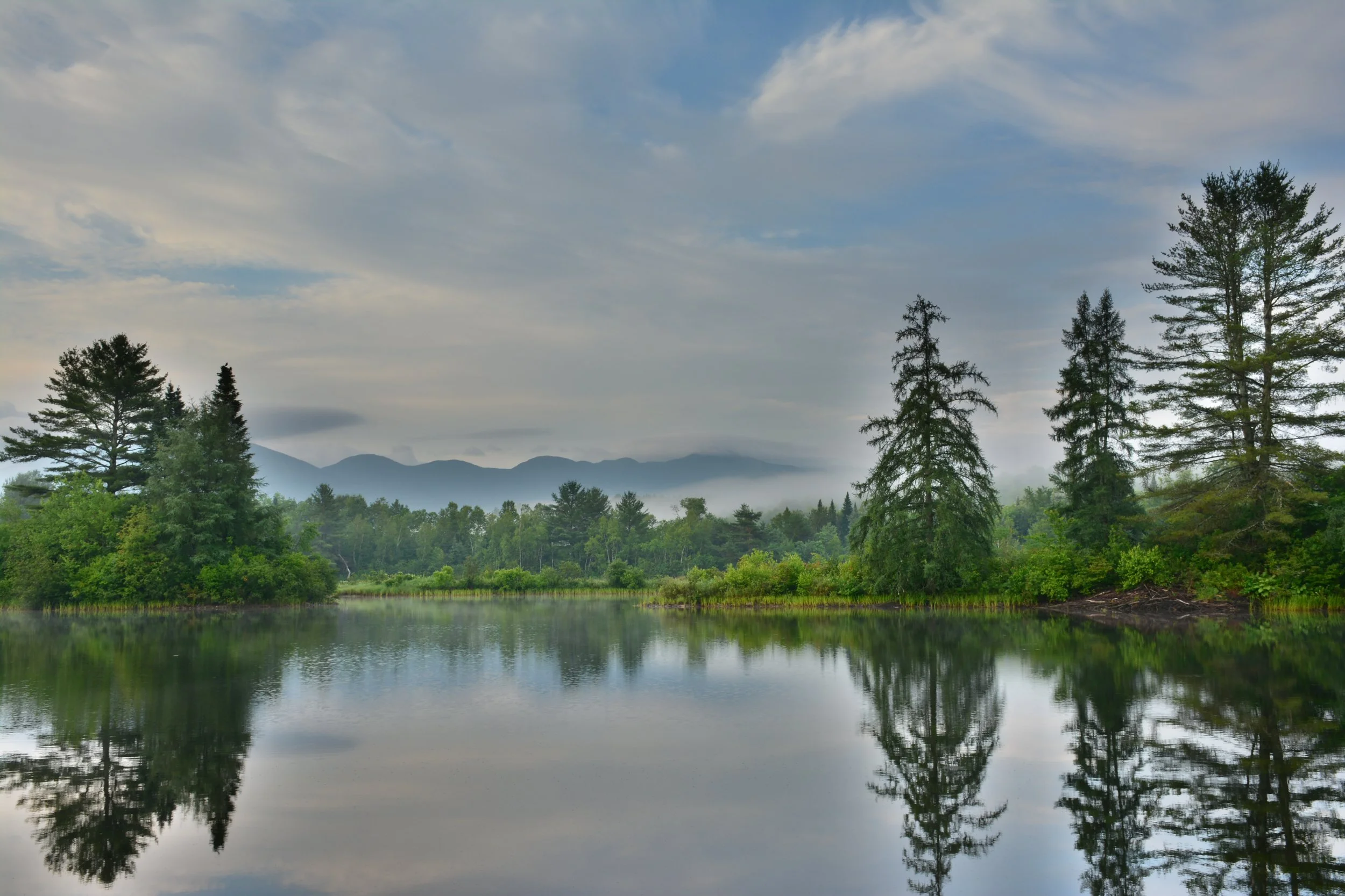 Coffin Pond in Franconia, New Hampshire, looking north towards Franconia Notch. The mountain tops visible in the distance are locally known as the Canon Balls (Canon Mountain ski area blocked from view behind the trees on the left). If you ever visit the area, be sure to head up the hill to Sugar Hill and stop at Polly’s Pancake Parlor…great views and great pancakes, maple products and more.