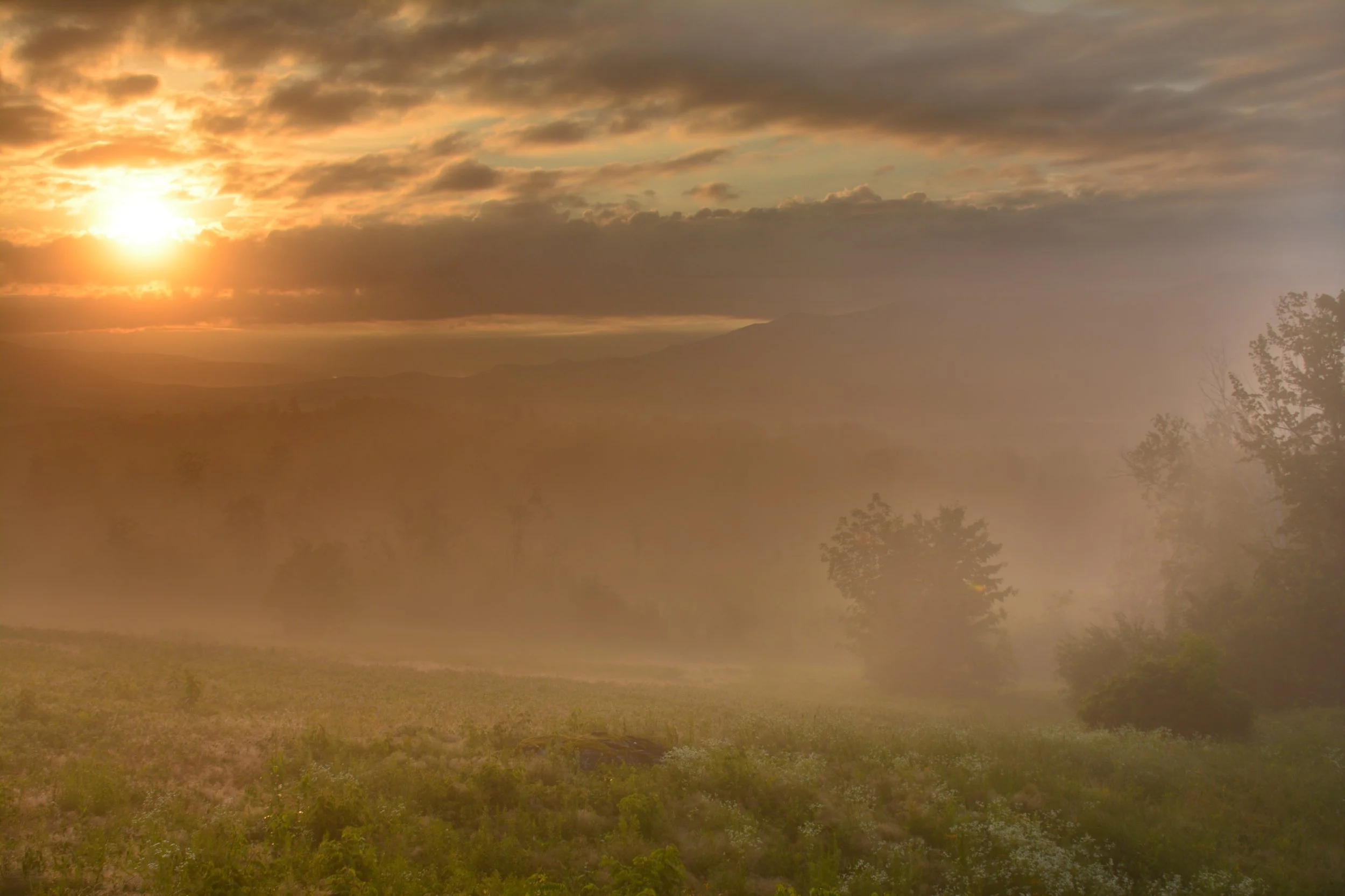Early morning near the Sunset Hill House, just off route 117 in Sugar Hill, New Hampshire. Obscured by the fog are the White Mountains and Franconia Notch. In the 1940s into the 50s there were numerous grand old hotels lining this ridge line and an annual horse show in the field below . Sadly, just one hotel remains, the Sunset Hill House, with it’s fine dining restaurant and a 9-hole golf course. All well worth visiting!